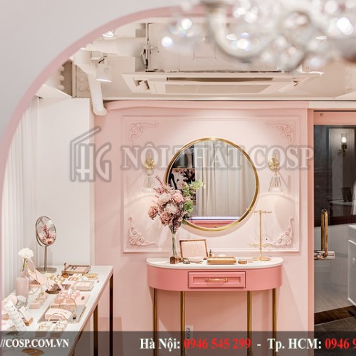 Lựa chọn màu sắc chủ đạo cho cửa hàng là màu hồng phấn và màu trắng, chúng tôi định hình phong cách cho shop với nét đáng yêu và hiện đại, mới mẻ. Khi kết hợp hai màu sắc này với nhau tạo nên sự đối lập nhẹ, vô cùng bắt mắt và cuốn hút, phù hợp với không gian dành cho những “cô nàng điệu đà”.