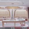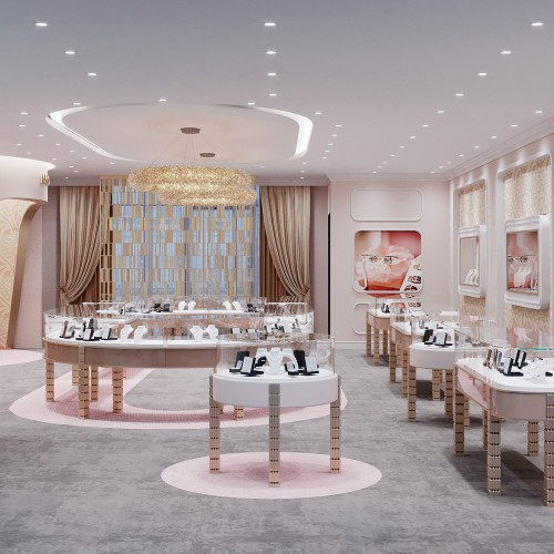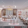 Không gian shop vàng bạc bên trong được thiết kế theo phong cách tân cổ điển với màu sắc chủ đạo là trắng và hồng vô cùng trang nhã và thanh lịch. Tường được thiết kế với họa tiết và hoa văn cổ điển cuốn hút và bắt mắt.