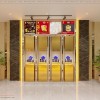 Nội thất tiệm vàng Hùng Cường đẹp với các tủ, kệ trưng bày bằng gỗ MDF phủ melamine, nẹp inox mạ xi vàng.
