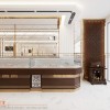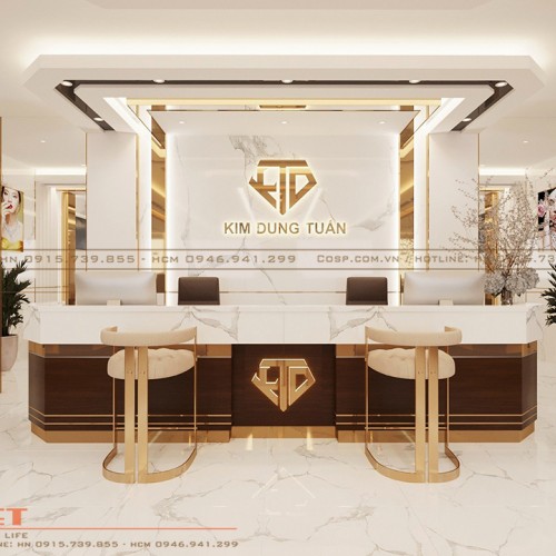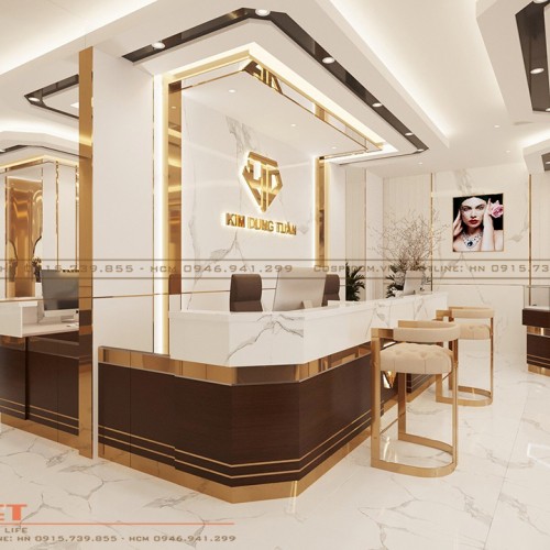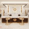 Cuối cùng là khu vực quầy lễ tân của trung tâm vàng trang sức - kim cương Kim Dung Tuấn. Quầy lễ tân được thiết kế đồng bộ với các mẫu quầy kệ trưng bày trang sức phía ngoài, tạo nên tổng thể thống nhất.