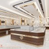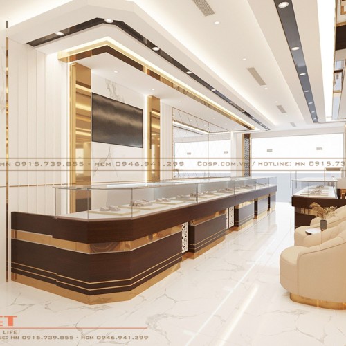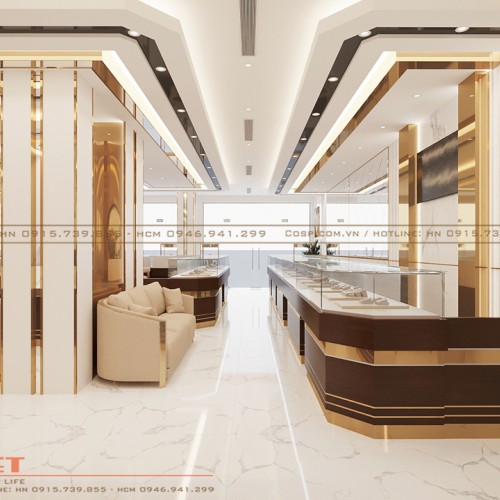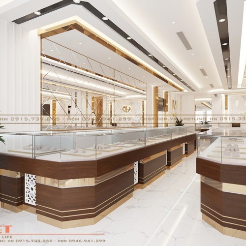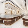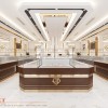 Với diện tích 100m2 khá rộng rãi giúp việc trưng bày trang sức và lựa chọn sản phẩm dễ dàng, thoải mái hơn. Tổng thể không gian được phân chia làm 3 khu vực trưng bày là quầy hàng chính giữa, bên trái và bên phải cửa ra vào.