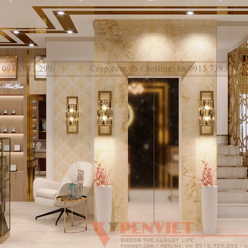 Đó là những món đồ nội thất cơ bản cần phải có trong các cửa hàng kinh doanh vàng bạc, trang sức. Để tạo nên một thiết kế cửa hàng vàng đẹp, KTS có sử dụng thêm tấm vách ngăn cầu thang bằng inox mạ vàng CNC cao cấp. Phần vách khác của cầu thang cũng được làm bằng gỗ thông ghép thanh sơn PU nhằm tạo cho khu vực này trông thẩm mỹ hơn. Ngoài ra, những chiếc đèn chùm decor cũng được lắp đặt phía trên mỗi khu vực trưng bày để tạo sự phản quang cho những món đồ trang sức giúp chúng trở nên lấp lánh hơn.