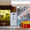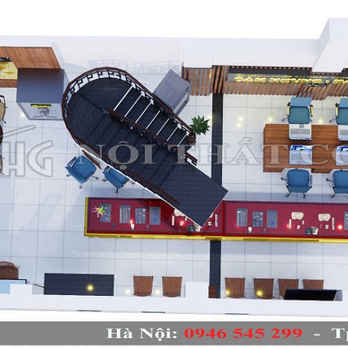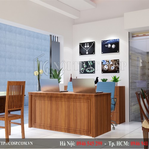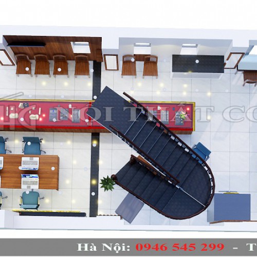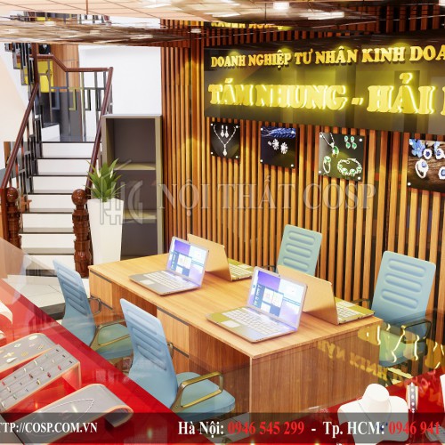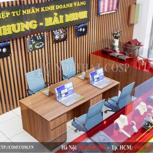 Nhân viên của tiệm vừa có không gian để di chuyển, tư vấn cho khách hàng vừa có đủ chỗ trống để làm viêc. Bức tường phía sau được trang trí bằng những thanh gỗ xếp xen kẽ nhau với màu nâu dịu nhẹ, kết hợp với tấm biển hiệu chữ mika phát sáng ở trên đó đã mang tới cho tiệm vàng những đường nét tinh tế, hiện đại và bắt mắt.