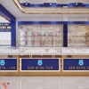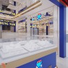 Thiết kế tiệm vàng Kim Dung Nam phong cách hiện đại, sử dụng màu xanh da trời kết hợp với màu vàng làm điểm nhấn nổi bật cho không gian. Phối hợp màu sắc mới mẻ này không chỉ mang đến cho cửa tiệm sự nổi bật, độc đáo mà còn giúp nâng tầm thương hiệu tiệm vàng.