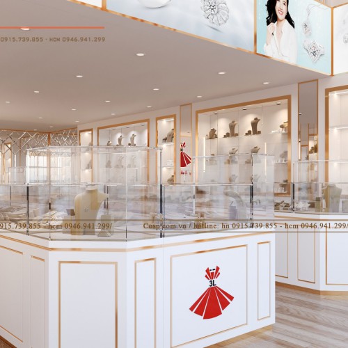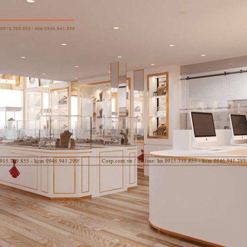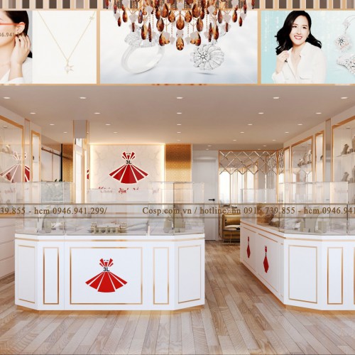 Hệ tủ kệ vàng bạc được sử dụng trong thiết kế tiệm vàng khá đa dạng về kiểu dáng tránh sự nhàm chán. Chúng tôi sử dụng hệ tủ kệ âm tường với nhiều đợt kính nhỏ để tạo ra nhiều không gian trưng bày sản phẩm hơn. Giữa nhà chúng tôi sử dụng 2 hệ tủ thấp vừa tầm để khách hàng dễ dàng quan sát. Toàn bộ hệ tủ vàng bạc sử dụng chất liệu gỗ MDF chống ẩm sơn 2K kết hợp với kính cường lực 10mm đảm bảo an toàn cho sản phẩm trưng bày. Hệ tủ vàng bạc chúng tôi sử dụng viền inox vàng gương 20*20 tạo nên sự sang trọng và cao cấp cho cả không gian.