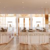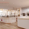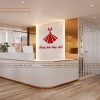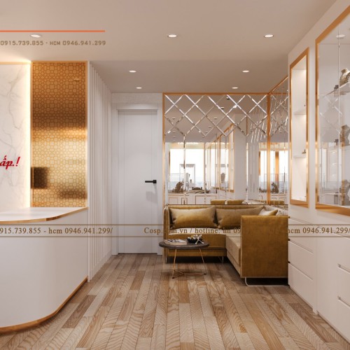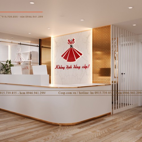 Bố cục nội thất tiệm vàng với các không gian khu vực tiếp tân và tư vấn và khu vực chính trưng bày sản phẩm vàng bạc. Khu vực tiếp tân được đặt phía trong cùng của tiệm với mục tiêu dễ dàng quản lý toàn bộ hoạt động của tiệm vàng. Thiết kế khu vực tiếp tân sử dụng bàn tiếp tân thiết kế kiểu dáng chữ L đơn giản nhưng hiện đại, sang trọng và tiện nghi. Phía sau là vách logo màu trắng nổi bật lên thương hiệu giúp khách hàng dễ dàng ghi nhớ hơn.