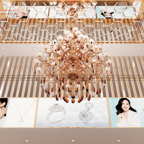 Thiết kế ánh sáng cho tiệm vàng cũng được chúng tôi đặc biệt chú ý. Chúng tôi sử dụng hệ đèn âm trần, toàn bộ không gian, đèn trang trí với thiết kế cách điệu mang đến ánh sáng thu hút nổi bật cho toàn bộ không gian shop. Ngoài ra, trong từng đợt tủ kính chúng tôi sử dụng hệ đèn led đảm bản sản phẩm trưng bày được lung linh nhất. Những loại đèn hiện đại được sử dụng không chỉ cung cấp nguồn ánh sáng ổn định và hài hòa mà còn tiết kiệm điện năng khi hoạt động chiếu sáng .