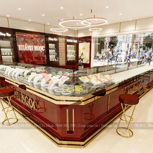 Mặc dù không gian cửa hàng Khánh Ngọc có thể đặt được nhiều hệ tủ để trưng bày sản phẩm nhưng chúng tôi đã tư vấn và đưa ra giải pháp thiết kế một hệ tủ quầy chữ L khép kín với mong muốn đảm bảo an toàn cho nữ trang và cửa hàng không cần có quá nhiều nhân viên tư vấn cho khách. Hơn nữa, khi thiết kế hệ tủ như vậy, khách hàng có thể ngắm nhìn sản phẩm ngay cả khi ở bên ngoài cửa hàng. Cách bài trí nội thất này trong thiết kế tiệm vàng Khánh Ngọc được dựa trên sự khảo sát thực tế và kinh nghiệm trong nghề của các kiến trúc sư Penviet giúp mang tới không gian mới lạ, độc đáo so với những đối thủ cạnh tranh.