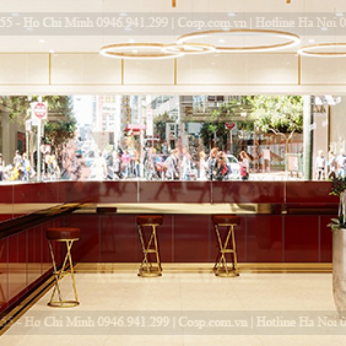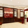 Quầy thu ngân là sự kết hợp giữa gỗ MDF phủ melamine màu vân gỗ và phủ sơn 2K màu đỏ rượu tạo ra sự cân bằng về màu sắc. Phía sau quầy là bảng biển trang trí khung gỗ MDF phủ sơn 2K và đi kèm hộp tranh giới thiệu sản phẩm phát sáng thu hút khách hàng. Tiếp nối quầy thu ngân là vách logo và các hệ tủ trưng bày các sản phẩm trang sức nhỏ.