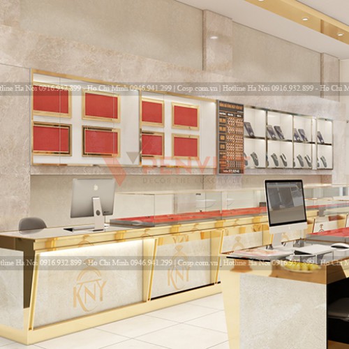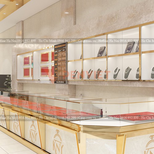 Các sản phẩm trang sức vàng bạc có đặc điểm là rất nhỏ gọn, vì thế ngoài hệ tủ đứng liền đất, Nội thất Penviet đã bố trí thêm những hệ tủ treo tường để trưng bày những sản phẩm nổi bật để khách hàng dễ dàng ngắm nhìn và chọn lựa.