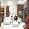 Kế bên quầy trang sức là không gian tiếp khách của cửa tiệm trang sức Kim Quang. Tại đây có bố trí dãy bàn ghế sofa gam màu trắng êm ái, đem lại sự thoải mái tối đa cho khách hàng.