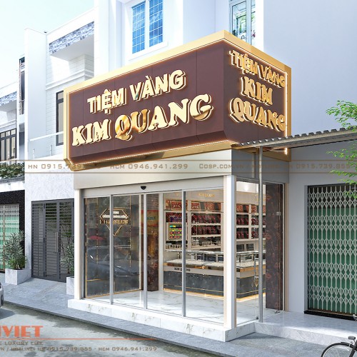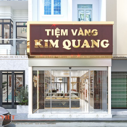 Tiệm vàng KIM QUANG sở hữu diện mạo sang trọng, đẳng cấp thu hút khách hàng quan tâm và ghé thăm chọn lựa trang sức. Nổi bật nhất là hệ thống biển bảng bằng khung sắt ốp Alu màu nâu xám với dòng chữ “ Tiệm vàng KIM QUANG” bằng inox mạ si vàng phát sáng chân.