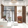 Khu vực này được ngăn cách với quầy trưng bày trang sức và khu vực cầu thang bằng hệ thống 2 loại cửa kính cường lực bền bỉ. Sự chia cách không gian bằng cửa kính tạo sự riêng tư nhưng thông suốt, không gây cảm giác bí bách, ngột ngạt. Hơn nữa, cửa kính còn có hiệu ứng mở rộng không gian, giúp cửa tiệm vàng rộng rãi hơn.