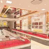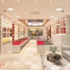 Phía cuối dãy giá kệ trang sức vàng là những bộ bàn ghế tiếp khách của tiệm vàng. Quý khách sẽ được nhân viên tư vấn tận tình, giải đáp mọi vướng mắc nhanh chóng khi cần mua trang sức. Bàn ghế sofa đệm êm ái với những gam màu hồng nhạt, ghi nhẹ nhàng và đẹp mắt.