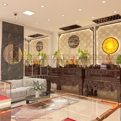 Ngoài ra, đây cũng là khu vực đặt bàn thờ Thần Tài Thổ Địa, bàn thờ Phật, bàn thờ gia tiên. Sự linh thiêng, trang trọng là điều đầu tiên chúng ta nhìn thấy khi đến với không gian này. Bàn thờ với gam màu gỗ nâu cổ kính với những họa tiết trang trí tinh xảo vừa uy nghi vừa trang nghiêm.