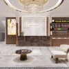 Quầy lễ tân bằng gỗ MDF An Cường phủ Laminate vân đá sang trọng được đặt ở vị trí thuận lợi giúp nhân viên dễ dàng bao quát toàn bộ không gian.