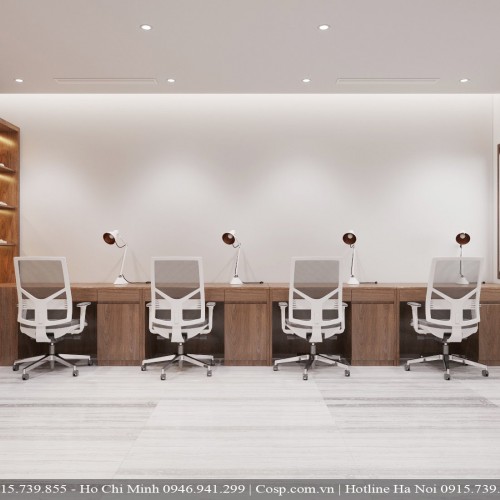 Khu vực này được bố trí các bàn làm việc bằng gỗ MDF chống ẩm An Cường phủ Melamine, chân sắt hộp sơn tĩnh điện ngăn nắp giúp tối ưu diện tích mặt bằng.