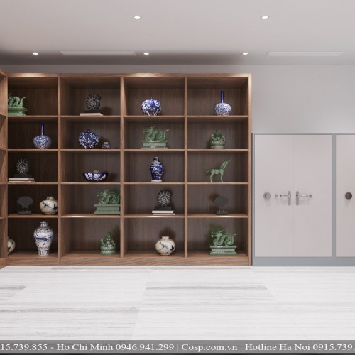 Tại đây, chúng tôi bố trí hệ thống két an toàn cùng tủ trưng bày bằng gỗ MDF chống ẩm phủ Laminate để đáp ứng yêu cầu sử dụng của chủ đầu tư.
