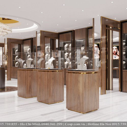 Hệ thống tủ trưng bày lớn bằng gỗ MDF chống ẩm phủ Laminate kết hợp thép tròn sơn tĩnh điện, hậu và 2 bên ốp Alu gương được bố trí sát tường vừa giúp trưng bày được nhiều sản phẩm, vừa tối ưu không gian cho cửa tiệm. Chúng tôi còn thiết kế đèn led trong tủ nhằm tôn lên vẻ đẹp sang trọng của những sản phẩm nữ trang cao cấp tại đây.