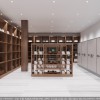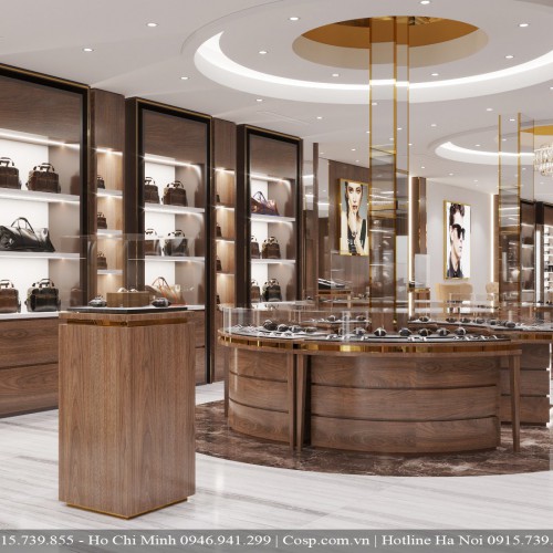 Chúng tôi lựa chọn gam màu nâu làm màu chủ đạo cho không gian kết hợp với những loại vật liệu cao cấp như gỗ óc chó, gỗ MDF chống ẩm An Cường phủ Laminate, kính cường lực siêu trong… nhằm làm toát lên tinh thần của mẫu thiết kế tiệm vàng Phúc Thắng. Các bề mặt có tính phản xạ ánh sáng tốt cũng sẽ khiến cho showroom trở nên lung linh, đẳng cấp, nâng tầm giá trị của những món trang sức được bày bán tại đây.