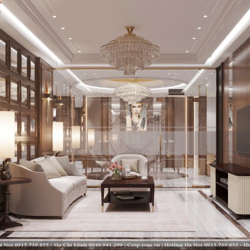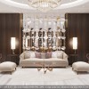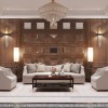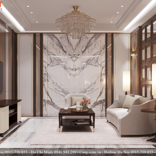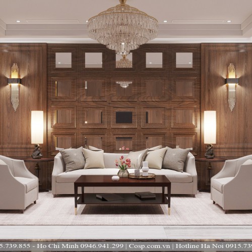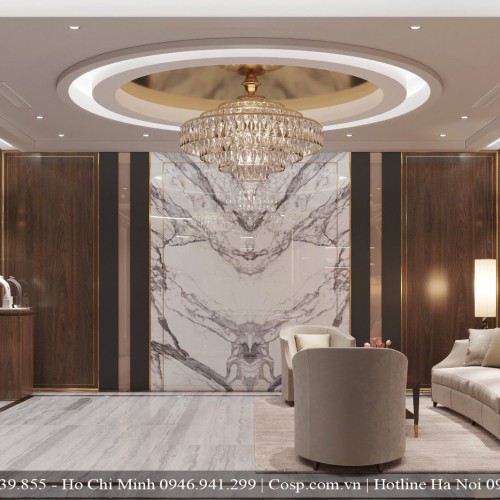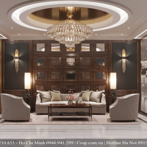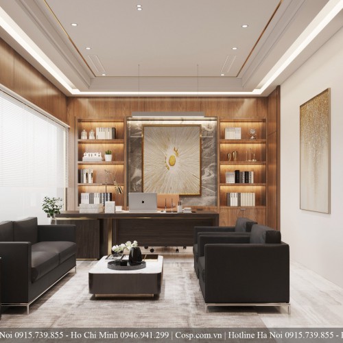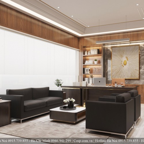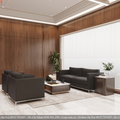 Sofa cao cấp cùng bàn trà thiết kế hiện đại bằng gỗ An Cường phủ Veneer kết hợp sơn PU sẫm màu, khung đỡ bằng Inox mạ vàng PVD, mặt bàn bằng đá Marble nhập khẩu cũng góp phần hoàn thiện vẻ đẹp của phòng làm việc.