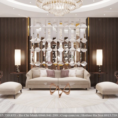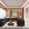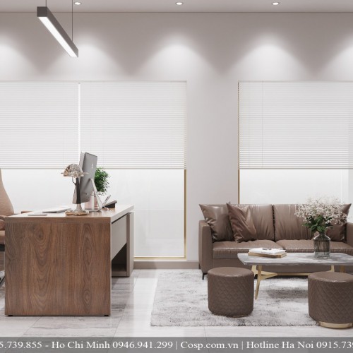 Bên cạnh đó, việc kết hợp các loại vật liệu cao cấp như Khung bằng gỗ sồi Nga đã qua tẩm sấy chống cong vênh, mối mọt kết hợp chân bằng Inox, Mút nệm Kim Đan, da bò Ý nhập khẩu, chỉ khâu Singapore cho sofa; gỗ An Cường phủ Veneer, khung đỡ bằng Inox mạ vàng PVD, mặt bàn bằng đá Marble nhập khẩu cũng phần nào thể hiện được sự đẳng cấp trong thiết kế nội thất văn phòng.