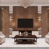 Kệ tivi khung bằng gỗ MDF An Cường phủ Acrylic soi rãnh sơn PU, mặt cánh tủ bằng gỗ Laminate mặt giống bề mặt nỉ hoặc da của An Cường, chân bằng Inox mạ PVD kiểu dáng đơn giản tạo sự nhất quán với ý tưởng thiết kế nội thất tiệm vàng.