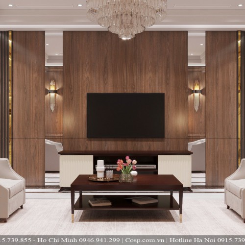 Việc sử dụng vật liệu gỗ sồi sơn PU kết hợp với khung bằng gỗ MDF An Cường phủ Acrylic kết hợp gỗ tự nhiên soi rãnh sơn PU cũng góp phần thể hiện đẳng cấp của chủ đầu tư cũng như sự trân trọng với đối tác.