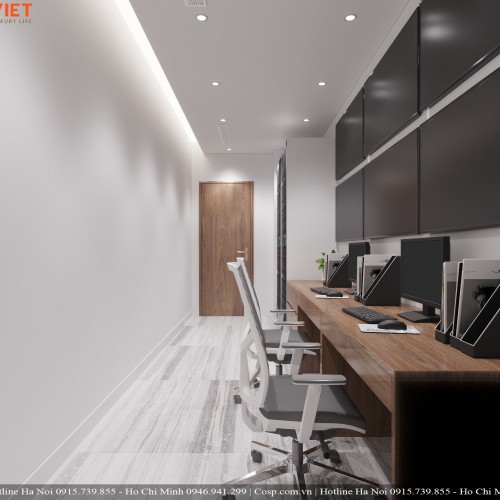 Với diện tích hạn chế, do đó, phòng máy chủ được chúng tôi bố trí các bàn làm việc bằng gỗ MDF An Cường phủ Melamine sát tường kết hợp với ghế chân xoay mang đến sự thoải mái cho người sử dụng.