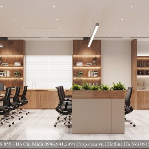 Để không gian phòng làm việc trở nên sinh động, tươi mới, chúng tôi thiết kế hộc đặt cây bằng gỗ MDF An Cường phủ Melamine. Điều này cũng mang đến sự tươi vui, thư thái cho nhân viên.