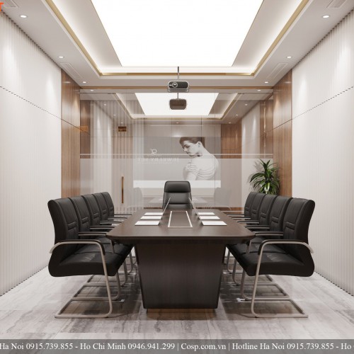 Để phù hợp với yêu cầu sử dụng, ý tưởng của chúng tôi khi setup không gian này là mang đến hình ảnh trang trọng, chuyên nghiệp, lựa chọn bàn họp bằng gỗ An Cường phủ Laminate, dưới chân dán Inox gương vàng cùng ghế chân quỳ Hòa Phát mang đến sự thoải mái, dễ chịu cho người sử dụng.