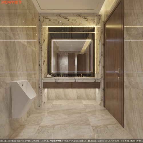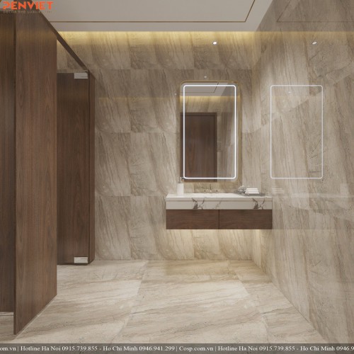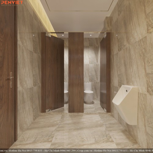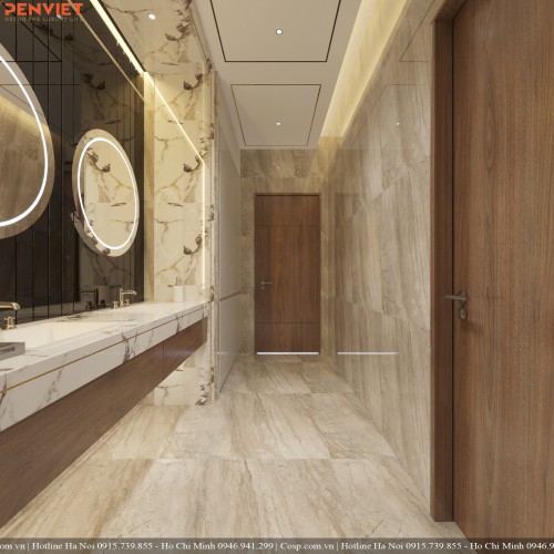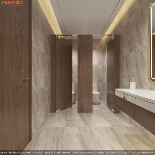 Ngoài ra, PenViet còn thực hiện thi công ốp xương gỗ thông tự nhiên ghép thanh, xử lý chống ẩm, chống cong vênh, bề mặt trang trí gỗ MDF An cường phủ Laminate, nẹp viền Inox mạ PVD vàng gương cho các cột; lắp đặt các vách gỗ An Cường phủ Laminate vân tạo sự nhất quán, đẳng cấp cho không gian.