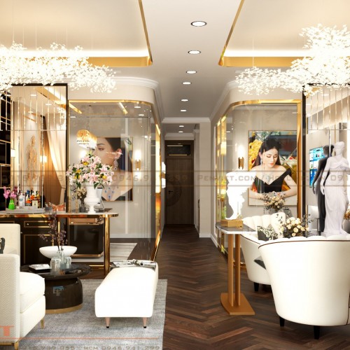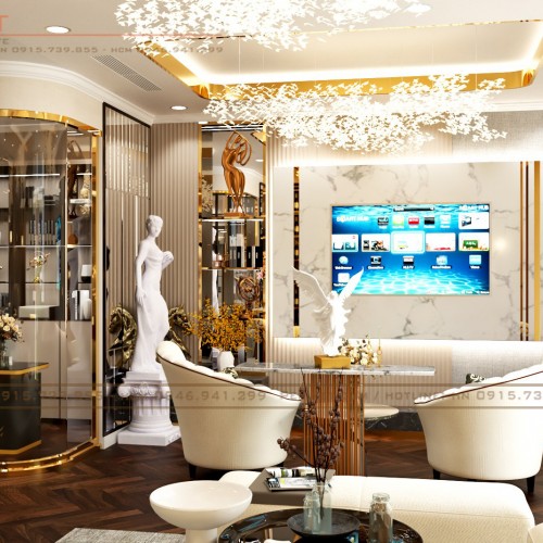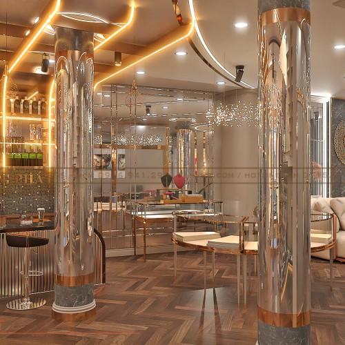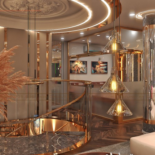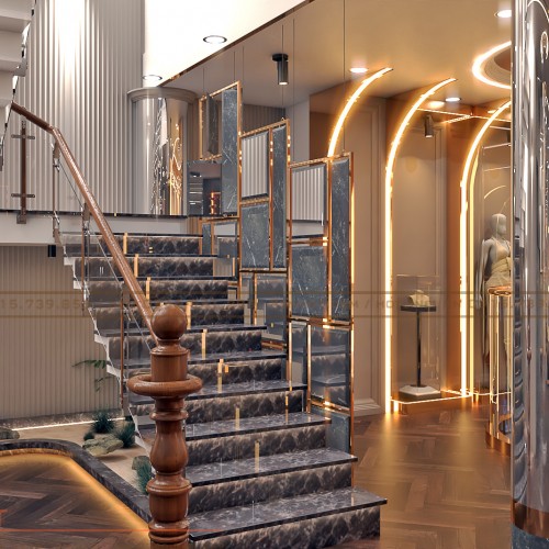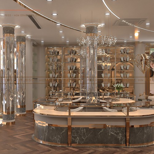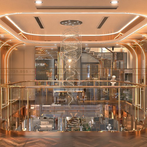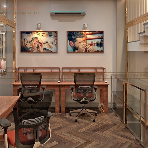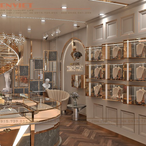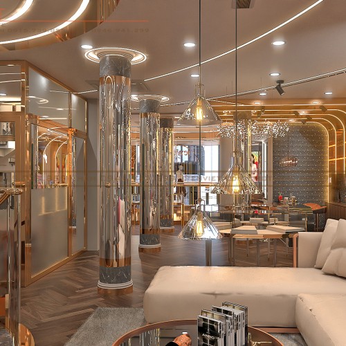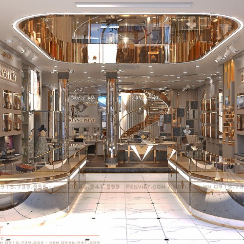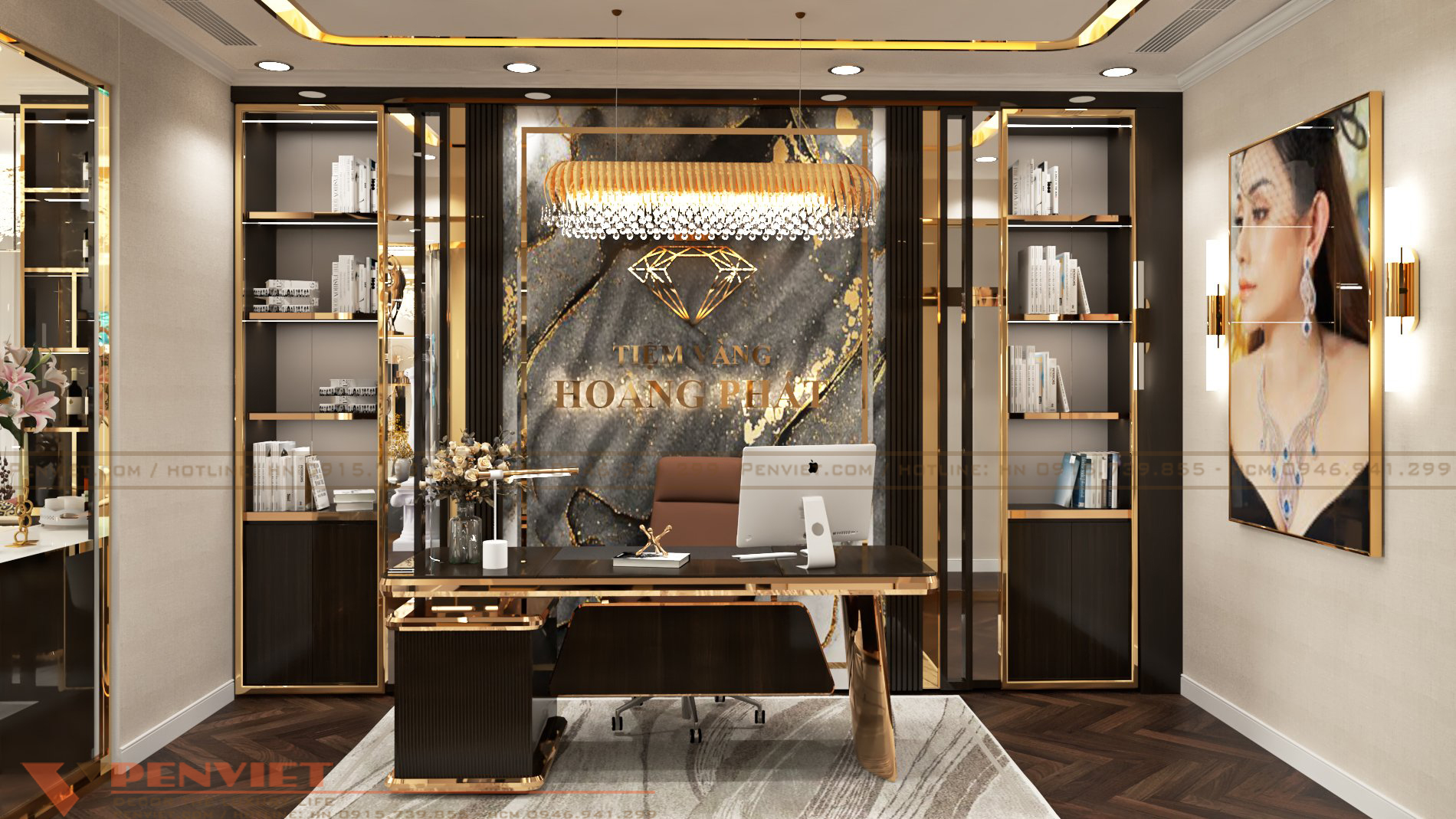Nội thất tiệm vàng được thiết kế theo phong cách luxury sang trọng. Với bố cục không gian khoa học: tầng trệt và tầng 1 làm showroom trưng bày. Tầng 2 được setup làm phòng làm việc, phòng khách. Tầng còn lại được cải tạo thành không gian sinh hoạt của gia đình.