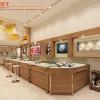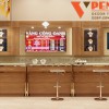 Hệ kệ phía sau kệ trưng bày sản phẩm chính trong mẫu thiết kế tiệm vàng Công Oanh vừa đóng vai trò để trang trí, vừa có tác dụng mở rộng khu vực trưng bày sản phẩm cho cửa hiệu.