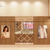 Hệ kệ này bao gồm vách ốp gỗ MDF phủ Melamine kết hợp với kính cường lực tạo thành các tủ trưng bày nữ trang sang trọng; hệ kệ trang trí sát tường bằng gỗ MDF phủ Melamine ốp đá Marble nhân tạo vân White caraca và các tủ rời làm từ gỗ MDF phủ Melamine giúp tăng không gian lưu trữ cho cửa hàng.