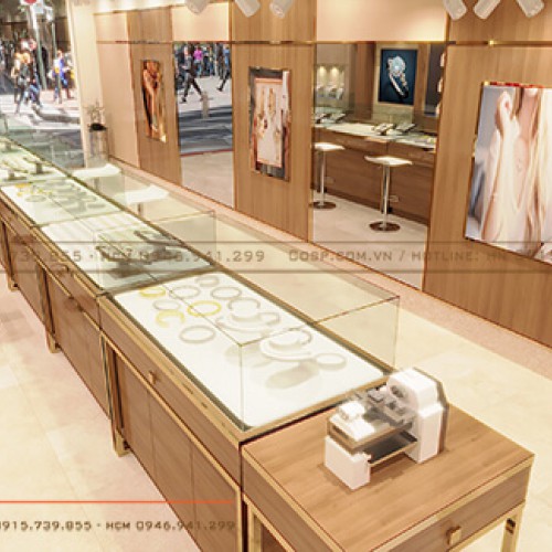 Các kệ trang sức bằng gỗ MDF chống ẩm phủ Melamine chân khung sắt sơn tĩnh điện kết hợp với kính cường lực được sắp xếp khéo léo tạo thành hệ kệ chữ L giúp phân chia không gian cửa tiệm. Điều này chẳng những mang lại sự riêng tư, thuận tiện cho nhân viên và khách hàng mà còn đảm bảo sự an toàn cho các món nữ trang cao cấp tại cửa hàng.