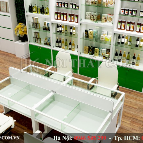Mẫu thiết kế cửa hàng nông sản sạch sở hữ hệ kệ, tủ kính trưng bày sát tường. Điều này giúp cho diện tích được tiết kiệm và không gian được tối ưu hóa, Khách hàng khi lựa chọn sản phẩm cũng sẽ thuận tiện hơn rất nhiều.
