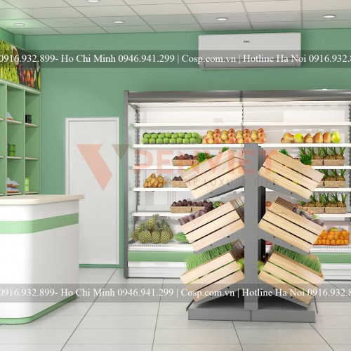 Với chiếc kệ bày bán các mặt hàng trái cây được gắn thêm bộ làm mát để đảm bảo độ tươi ngon cho sản phẩm. Dưới mỗi đợt kệ được gắn đèn led chiếu vào các sản phẩm nông sản giúp khách hàng cảm nhận được độ tươi ngon và căng mọng của trái cây.