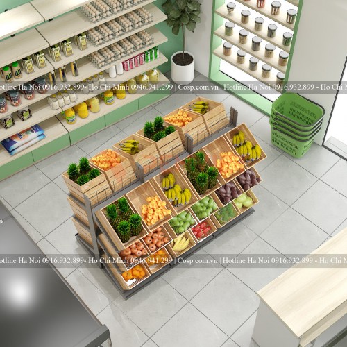 Loại kệ được sử dụng trong shop rau củ quả Neco Mart là loại kệ tầng nhiều ngăn được đặt sát tường và giá đứng giữa nhà. Chiếc giá đứng giữa nhà được lắp đặt các thùng gỗ lớn trên các khay tầng nhằm tạo nhiều ô trống để bày bán các mặt hàng rau củ khác nhau. Đây cũng là chiếc kệ được chúng tôi tư vấn và sử dụng rất nhiều cho các chủ đầu tư trong các dự án thiết kế shop trái cây bởi những tiện ích mà nó mang đến.
