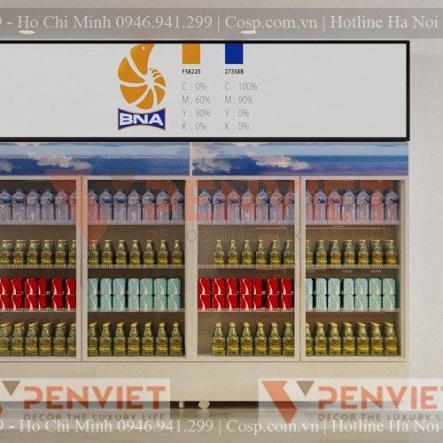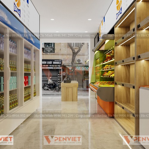 Cửa hàng bán thực phẩm sạch thì chắc chắn không thể thiếu các tủ mát và tủ lạnh bảo quản được rồi. Dàn tủ mát lớn sẽ được đặt riêng một bên tường để bày bán các loại nước giải khát khác nhau. Tuy nhiên đối với tủ lạnh thấp, Penviet đã tận dụng khoảng không phía trên và cho lắp đặt kệ gỗ để gia tăng không gian trưng bày.