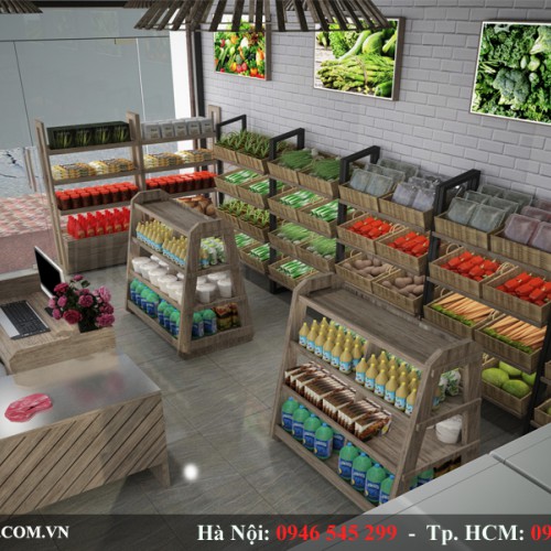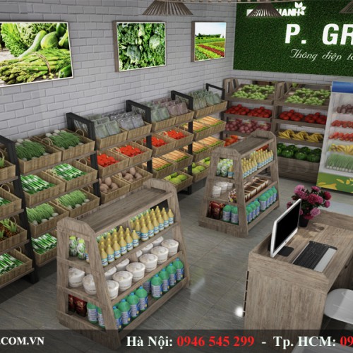 Phần kệ trưng bày được đặt sát men theo những khoảng tường giúp cửa hàng tiết kiệm và tận dụng tối đa không gian và diện tích của căn phòng. Sản phẩm được đặt trên chủ yếu là rau, quả tươi sạch.