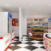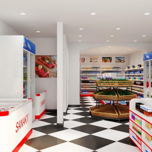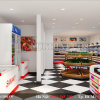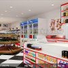 Mẫu thiết kế cửa hàng đẹp này là tổ hợp của những đường nét hiện đại nhất. Màu trắng tinh khiết từ các tường nhà tô điểm cho những điểm nổi bật của các thực phẩm sạch trưng bày trong đó. Đầy đủ các loại hoa quả, nước ép nguyên chất được bảo vệ trong các tủ lạnh. Các tủ màu trắng hoà quyện vào tường tạo nên một cảm giác dễ nhìn cho mọi người hơn. Sự sắp xếp gọn gàng và hợp lý các khu vực, trưng bày hoa quả, nước uống đúng vị trí tạo cảm giác căn phòng vẫn thoải mái và thoáng mát. Trên tường dán vài ba bức tranh về hoa quả để bắt mắt, thu hút người mua hơn.
