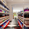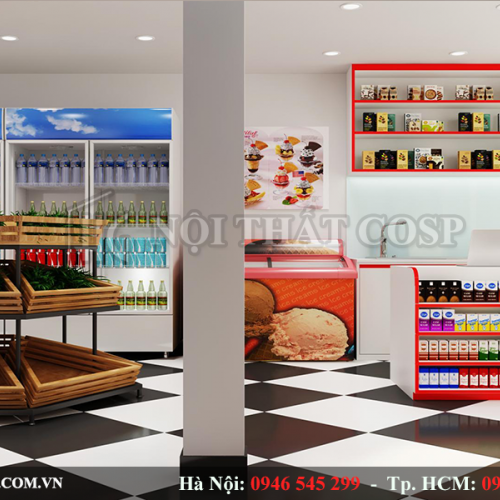 Diện tích 50m2 cũng đủ để KTS của COSP mang tới một không gian hài hoà và rộng rãi vừa đủ. Thiết kế cho anh Tuấn một quầy thu ngân đẹp, rộng và tiện lợi nhất có thể. Đó là một màu trắng hoà vào màu tường của cửa hàng, tô điểm trên những đường line là màu đỏ sáng bắt mắt. Đó là thiết kế một kệ trưng bày các sản phẩm nhỏ như sữa, dinh dưỡng...