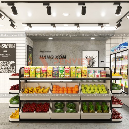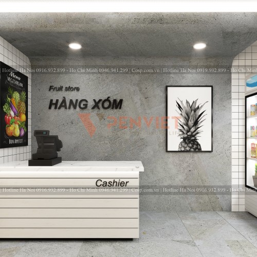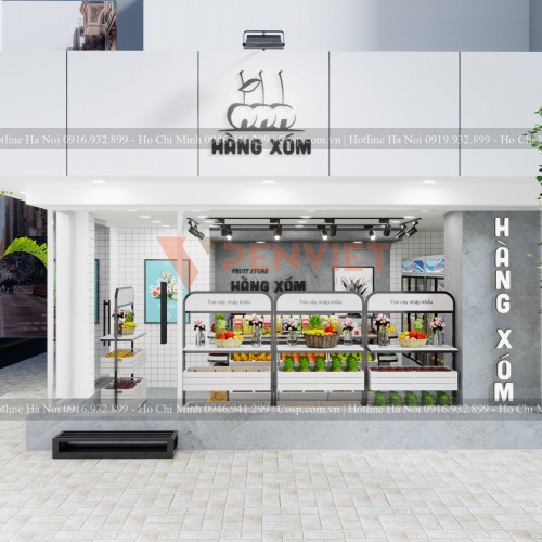 Hợp tác cùng Penviet, anh Cường muốn cửa hàng trái cây của mình thật hiện đại và để lại ấn tượng tốt trong mắt khách hàng. Cũng giống như tên gọi, mẫu thiết kế cửa hàng trái cây nhập khẩu Hàng Xóm này tạo sự thân thiện, gần gũi như những người hàng xóm thân tình cạnh nhà.