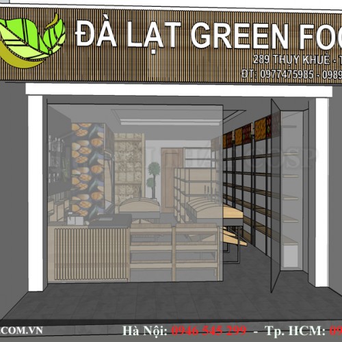 Thiết kế mặt tiền shop với bảng hiệu: “ĐÀ LẠT GREEN FOOD” phông chữ màu trắng nổi bật giữa tông màu vàng nâu, tạo sự ấn tượng cho khách hàng ngày từ ánh nhìn đầu tiên.
