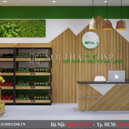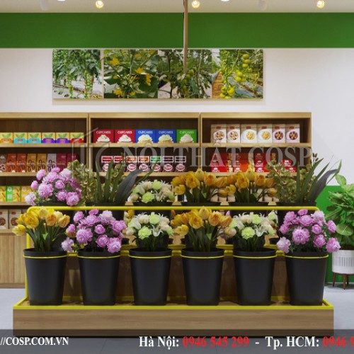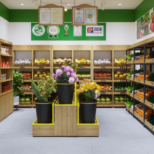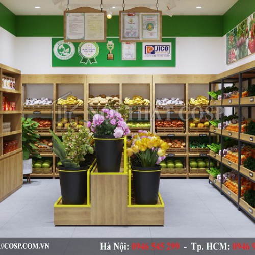 Còn về thẩm mĩ thì với tông màu vàng gỗ, chúng góp phần tạo nên một không gian thân thiện với khách hàng và phù hợp với các mặt hàng rau củ quả.