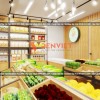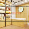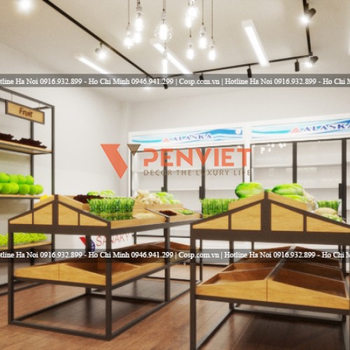 Không gian nội thất bên trong được bố trí với các các tủ kệ đặt sát tường để tối ưu không gian tốt hơn. Hệ kệ này được phân thành kệ trưng bày đồ khô và kệ trái cây riêng. Sử dụng kệ đồ khô trong thiết kế shop với gỗ MDF cốt Malaysia phủ Melamine với khung sắt sơn tĩnh điện để tạo độ chắc chắn. Phần kệ gỗ trái cây được làm bằng sắt sơn tĩnh điện kết hợp gỗ cao su ghép thanh với bộ chữ mica dán dẹt ở phía trên.