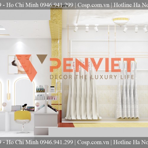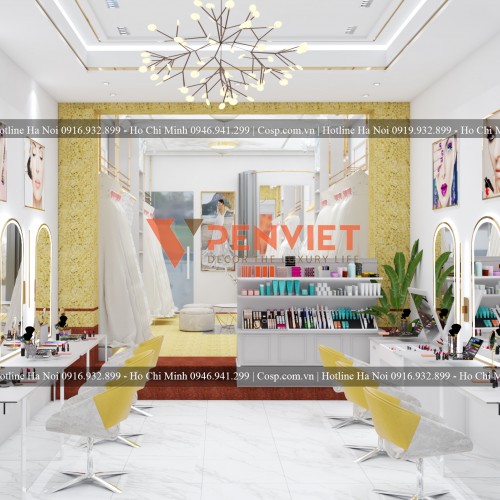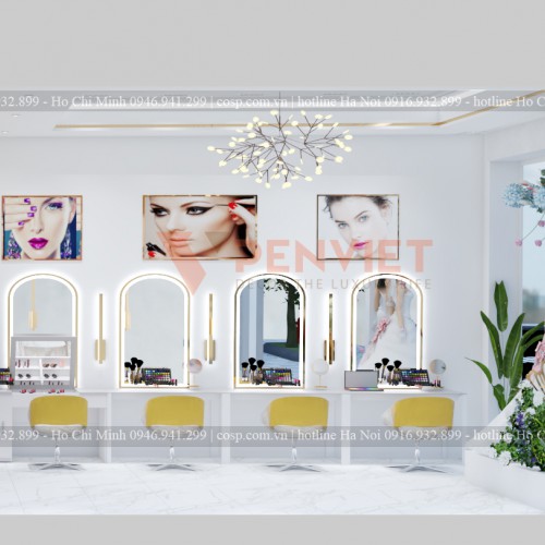 Để phục vụ cho công việc trang điểm được tốt nhất thì tất nhiên không thể bỏ qua các món mỹ phẩm và các dụng cụ trang điểm rồi. Nội thất Penviet đã lắp đặt thêm một kệ gỗ với nhiều ngăn để các sản phẩm mỹ phẩm trang điểm được sắp xếp gọn gàng hơn. Khi thấy các món mỹ phẩm được cất trữ gọn gàng sẽ tạo sự chuyên nghiệp và cái nhìn thiện cảm trong mắt khách hàng tốt hơn.