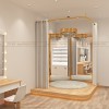 Trong cửa hàng áo cưới thì không thể thiếu khu vực thử đồ và bục gương cho câu dâu. Tuy lựa chọn phong cách thiết kế đơn giản, nhưng cửa hàng áo cưới Ngọc Diễm vẫn đầy đủ công năng. Bục thử đồ với gương lớn và bộ rèm màu ghi cao cấp. Để không gian không bị đơn điệu, các KTS đã thiết kế những đường viền bao quanh màu vàng tinh tế. Đường nét mềm mại và hài hòa với tổng thể của không gian. Trên trần còn treo bộ đèn chùm ánh vàng sang trọng. Ánh đèn, giúp mỗi cô dâu đều trở lên xinh đẹp và lộng lẫy hơn.