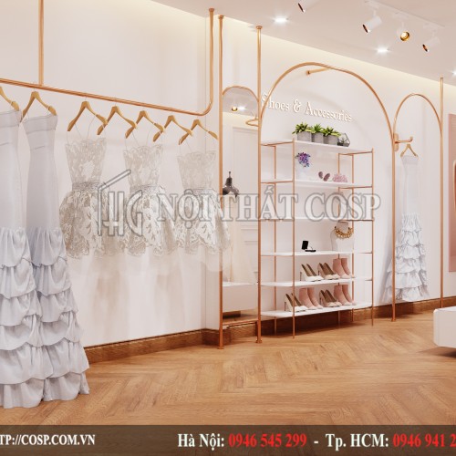 Trong các thiết kế shop quần áo, đặc biệt là shop áo cưới, loại giá treo đồ sẽ được sử dụng nhiều hơn so với các kệ gỗ trưng bày. Bởi quần áo được treo lên sẽ không bị nhăn nhúm, làm mất form đồ khiến khách hàng khó hình dung và cảm nhận hết cái đẹp của sản phẩm. Do đó, chúng tôi đã sử dụng loại giá treo đơn bằng sắt sơn tĩnh điện được gắn chắc chắn trên trần hoặc dưới sàn nhà trong mẫu thiết kế cửa hàng áo cưới này để chịu được sức nặng của nhiều bộ trang phục.